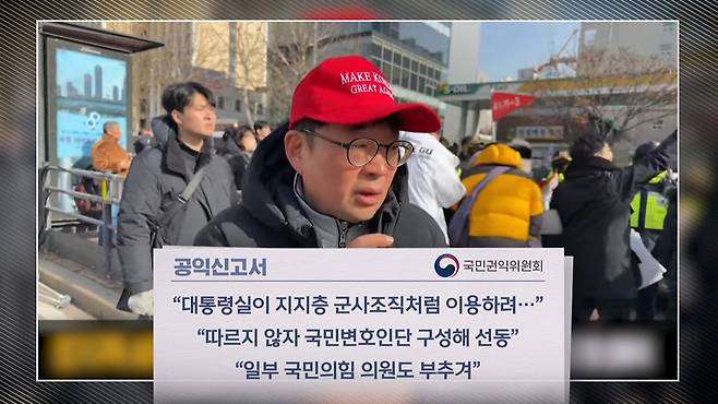 MBC가 확보한 신 씨의 공익신고서에 따르면 신 씨 측은 대통령실이 지지층을 군사조직처럼 이용하려 했지만, 신 대표가 이를 따르지 않자 국민변호인단을 구성해 선동하고, 일부 국민의힘 의원도 폭동을 부추겼다고 주장했습니다.