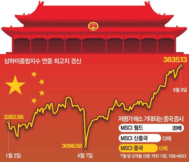 10일 금융투자업계에 따르면 지난 8일 상하이종합지수는 연초보다 11.42% 오른 3635.13에 마감했다. 상하이종합지수는 8일 장중 3647.37을 기록하며 연중 최고치를 경신했다.