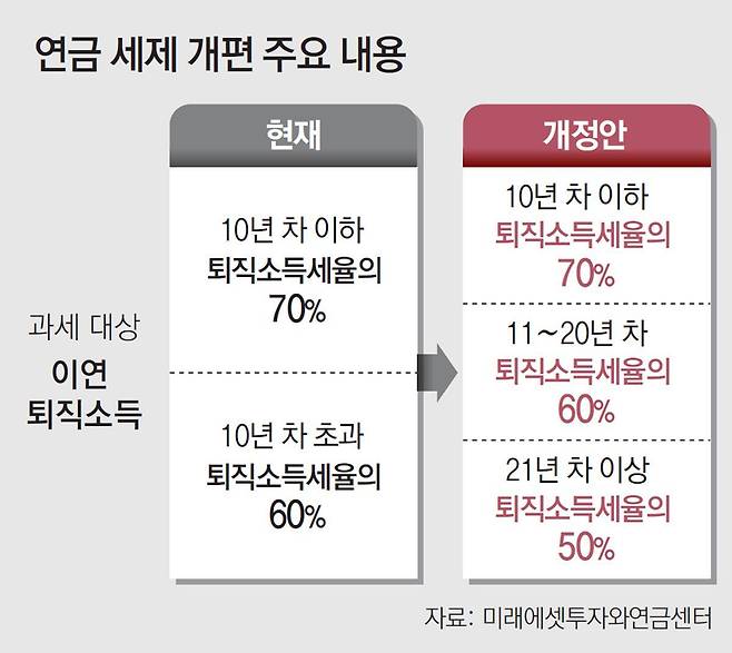 다른 하나는 오랫동안 연금을 받는 사람에게 더 많은 혜택을 주는 방향으로 세제를 개편해 나가고 있다는 점이다. 늘어나는 수명에 맞춰 연금의 수명도 늘려야 하기 때문이다. 이번에 정부가 내놓은 연금세제 개편 방향도 크게 다르지 않다.