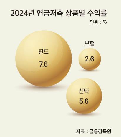 ◆ 연금저축펀드 수익률 높은 이유는=금융감독원이 최근 발표한 ‘2024년 연금저축 운용현황’을 살펴보면 지난해 전체 연금저축 연간 수익률은 전년 4.6% 대비 0.9%포인트 하락한 3.7%를 기록했다. 상품별 수익률은 연금저축펀드 7.6%, 연금저축신탁 5.6%, 연금저축보험 2.6% 순으로 나타났다. 연금저축펀드의 수익률이 연금저축보험의 낮은 수익률을 상쇄하고 전체 수익률을 견인한 셈이다.