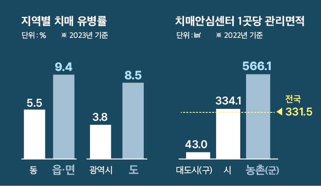 ◆ 치매 유병률, 농촌이 도시의 두배=농촌은 치매 고위험지역으로 분류된다. 보건복지부의 ‘2023년 치매 역학조사·실태조사’에 따르면 읍·면 지역의 치매 유병률은 9.4%로, 동 지역(5.5%)보다 3.9%포인트 높았다.