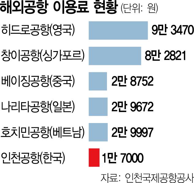 그러나 순이익은 반토막 수준인 3970억 원 수준에 그칠 것으로 전망된다. 2001년 개항 이후 세계에서 가장 낮은 수준을 유지하고 있는 공항이용료 때문이다. 인천공항의 여객공항 이용료는 2025년 7월 기준 1만7000원으로 개항 1년 후인 2002년 한 차례 오른 뒤 20년 넘게 동결이다. 이는 세계 공항 순위에서 바로 윗계단에 위치한 히드로공항의 9만3470원(하나은행 매매기준율 적용) 대비 5분의 1 수준에 그치는 수준이다. 공항 순위를 두고 경쟁하는 싱가포르 창이공항은 6만823원이며, 베트남 호치민 공항조차 2만 9997원으로 인천공항보다 높다.