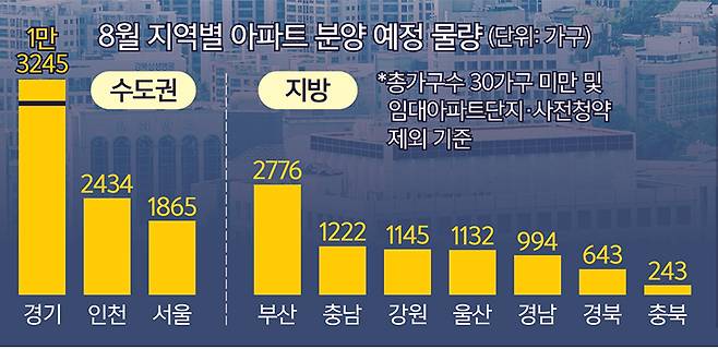직방 조사 기준으로 이달 비수도권에서는 △부산 2776가구 △충남 1222가구 △강원 1145가구 △울산 1132가구 △경남 994가구 △경북 643가구 △충북 243가구 등의 공급이 예정돼 있다.