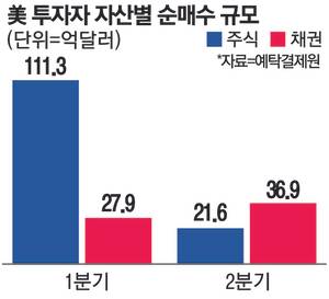 10일 한국예탁결제원에 따르면 올해 2분기 국내 투자자들은 미국 국채를 총 36억9100만달러(약 5조6070억원)어치 순매수했다. 이는 분기 기준 역대 최대 규모다. 지난 1분기에는 미국 주식 순매수액이 채권의 4배에 달했지만, 2분기에는 오히려 채권 순매수액이 21억6000만달러(약 2조9592억원)인 주식을 앞질렀다.