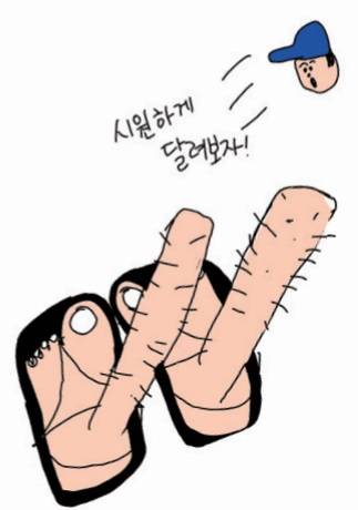 "어떤 사람이 내리막 흙길을 샌들 신고 달려 내려오더라고요. 깜짝 놀랐어요. 대단하다고 생각되기 전에 '저 사람 발 괜찮을까?'라는 생각이 먼저 들더라고요. 그 사람에게 발 멀쩡한지 물어보고 싶었는데, 너무 빨리 사라지는 바람에 못 물어봤어요. 그분이 신었던 샌들은 뭘까요? 날렵한 모양이었는데, 끈도 얇았고요."