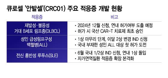 큐로셀 관계자는 "성인 ALL 2상과 SLE 1상 모두 연내 진입할 예정이며, 특히 SLE 대상 임상은 적응증 확대 및 파이프라인 확장에 속도를 내고 있는 국내 최초 상용 CAR-T 치료제 개발사로서의 입지를 한층 강화하는 기회가 될 것으로 보고 있다"고 말했다.