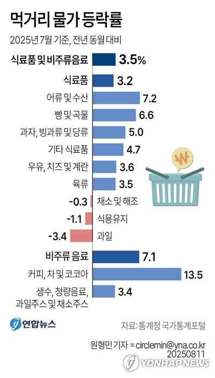 (서울=연합뉴스) 원형민 기자 = 11일 통계청 국가통계포털(KOSIS)에 따르면 7월 식료품 및 비주류음료 물가지수는 125.75(2020년=100)으로 작년 동월보다 3.5% 상승했다.