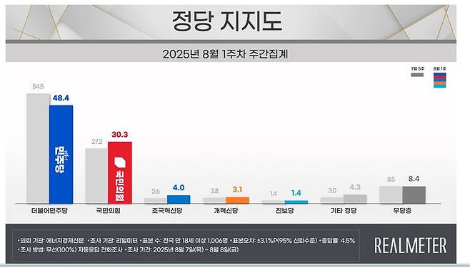 지난 7일부터 8일까지 전국 18세 이상 유권자 1,006명을 대상으로 한 정당 지지도 조사에서는 더불어민주당이 48.4%, 국민의힘이 30.3%를 각각 기록했습니다.
