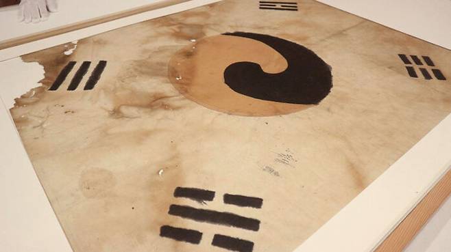 일제강점기 당시 일장기를 먹으로 덧칠해 만든 '서울 진관사 태극기'입니다.