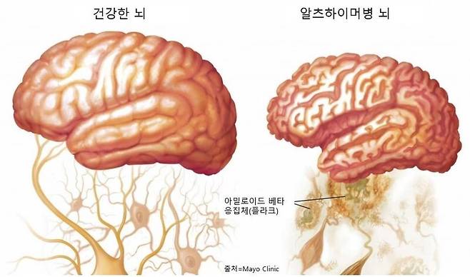 알츠하이머병 치매는 뇌 속에 비정상적 단백질인 ‘아밀로이드 베타’와 ‘타우 단백질’이 쌓이고 엉켜 신경세포를 손상시키는 것이 주요 원인이다. 이 가운데 아밀로이드 베타 단백질은 원래 신경세포 밖에서 신경세포를 보호해주는 단백질이다. 그런데 이것이 비정상적으로 쌓여 플라크를 이루면 신경세포간 신호 전달을 방해하고 주변 뇌세포에 염증 반응을 일으켜 신경세포를 손상시킨다. 초기 단계에 주로 나타나는 현상이다.