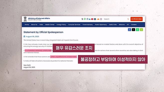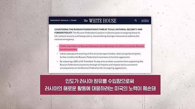 이에 대한 백악관의 설명은 이렇습니다. 인도가 러시아 원유를 수입을 함으로써 "러시아의 해로운 활동에 대응을 하려는 미국의 노력이 훼손되었다"라고 하면서요. 이번 관세 조치의 목표가 "러시아의 지속적인 침략, 즉, 우크라이나에 대한 러시아의 공격에 대해서 심각한 경제적 결과를 초래하는 것이다"라고 했습니다.