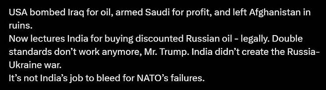 한 인도인은 미국이 인도가 러시아산 석유를 합법적으로 구매하는 것에 대해서 지적을 하고 있는데 이것은 이중 잣대다라고 비판을 했는데요. 이런 비판하는 글들이 굉장히 많이 확산이 되고 있습니다.