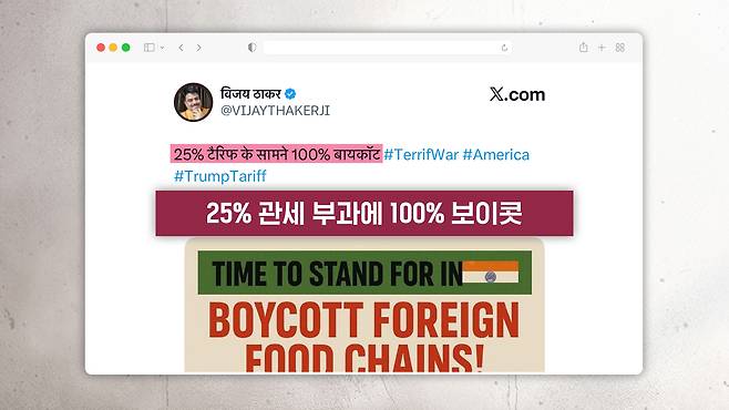 그리고 한 인도인이 미국 브랜드들을 그림으로 쭉 나열을 한 후에 이 제품들을 구매하지 말고 인도 제품을 구매하자, 이렇게 미국 제품 불매를 독려하는 글을 올렸는데요. 이 글들도 확산을 하는 모습입니다.