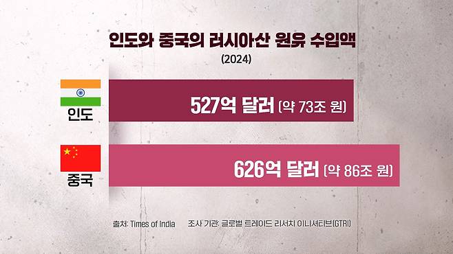중국의 러시아산 원유 수입액이 2024년 626억 달러, 우리 돈으로 하면 약 86조 원인데 인도에 527억 달러, 우리 돈으로 약 73조 원을 넘어섰음에도 불구하고 트럼프 대통령이 인도를 선택적으로 비판하고 있다, 이렇게 보도를 하기도 했습니다.