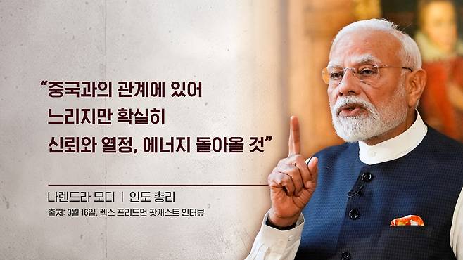 중국이 지금 웃고 있는 이유 그런데 이러한 상황 속에서 조용히 웃고 있는 국가가 있습니다. 바로 중국입니다. 사실 인도는 1962년 국경 분쟁 이후에 중국과 오랜 기간 긴장된 관계를 이어왔고요. 또 2020년에 라다크 갈완 계곡에서 또 인도군과 중국군 간에 충돌이 벌어지면서 관계가 급격히 다시 악화된 상태였거든요. 그런데 갑자기 올해 초를 기점으로 중국과 관계 회복에 나서는 모습이 포착이 됩니다. 지난 3월 16일에 공개가 된 팟캐스트 인터뷰에서 모디 총리가 이런 말을 합니다.