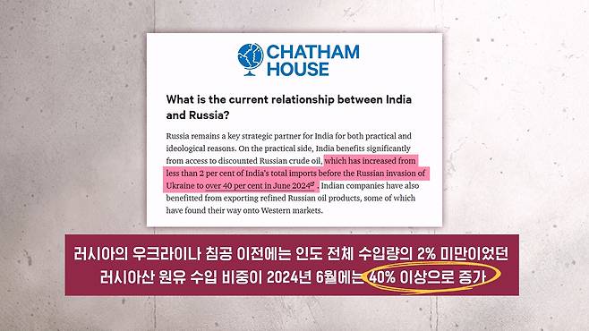 러시아의 우크라이나 침공 이전에는 인도 전체 수입량의 2% 미만에 불과했던 러시아 원유의 수입 비중이 지난해 6월에는 40% 이상으로 껑충 증가했습니다.