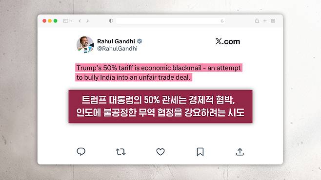 그런데 미국이 어제 총 50% 관세를 인도에 부과하니까 간디 전 대표는 자신의 SNS에 "트럼프 대통령의 50% 관세는 경제적인 협박이다"라고 하면서 "인도의 불공정한 무역 협정을 강요하려는 시도다"라고 했습니다.