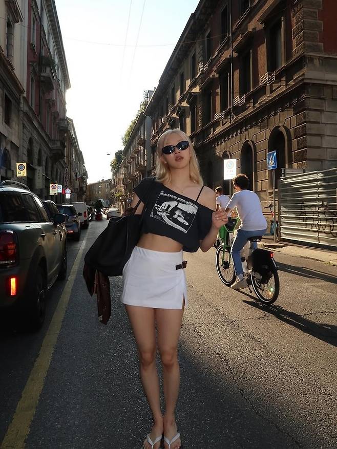 거리 한복판에 서 있는 로제는 원숄더 티셔츠에 미니멀한 화이트 스커트를 매치해 상하의 대비를 극대화했다. 블랙 빅백을 어깨에 걸친 채 여유롭게 서 있는 모습은 마치 패션 화보 속 한 장면 같다.
