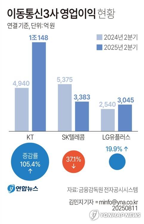 (서울=연합뉴스) 김민지 기자 = 11일 금융감독원 전자공시시스템에 따르면 올해 4월 SK텔레콤[017670] 해킹 사태로 인해 SKT의 2분기 영업이익이 전년 동기보다 줄어든 반면, KT[030200]와 LG유플러스[032640]의 영업이익은 늘었다.