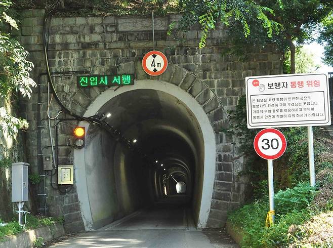 | ▲ 영화 '똥개'의 촬영지인 월연타널. 1905년 경부선 개통당시 사용하던 용평터널로 이후 경부선 복선화로 선로를 이설하면서 일반도로로 사용되고 있다. |