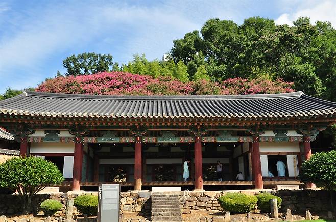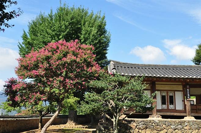 출입문 역할을 하는 풍화루를 지나자 눈앞에 아름다운 풍경이 펼쳐졌다. 유생들의 강학공간인 명륜당 지붕 위를 덮을 듯 만개한 배롱꽃이 마치 병풍처럼 둘러싸고 있었다. 고택 지붕과 배롱꽃의 멋진 조화였다. 작은 도서관 옆에도 배롱나무 한 그루가 멋스럽게 서있다. 꽃이 귀한 여름, 붉게 피어난 배롱꽃을 보며 더위에 지친 마음을 달래본다.
