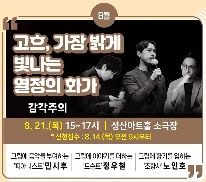 강연자 예술 융합팀 '감각주의'는 국내 대표 미술사 전문가인 도슨트 '정우철', 피아니스트 '민시후', 조향사 '노인호'가 고흐의 작품을 입체적으로 풀어낼 예정이다.