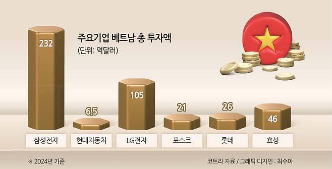 실제 LG디스플레이(23억5000만달러), 삼성디스플레이(12억달러) 등 삼성전자와 LG전자 및 계열사 등 기존에 베트남에 진출한 주요 대기업들은 지난 3년간 대규모 증액 투자를 단행했다.