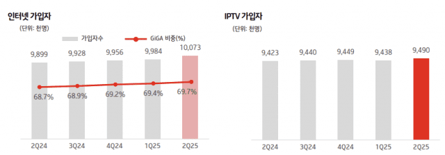 먼저 인터넷 사업은 6천314억원의 매출을 기록하며 2.1% 증가했다. 초고속인터넷 가입자가 2분기 들어 1천만 회선을 돌파했고, 기가인터넷 비중도 69.7%까지 높아졌다. 타사와 달리 미디어 매출도 늘어난 5천269억원을 기록했는데 가입자 증가 반등에 따른 결과로 풀이된다. 줄곧 매출 감소를 겪던 홈유선전화는 지난해 대비 0.4% 증가한 1천762억원을 기록했는데, 보편역무 사업자에 대한 손실 보전금이 유입된 결과다.