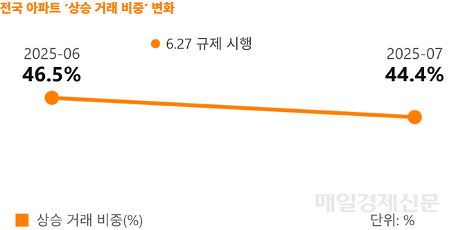 6.27 대출 규제 이후 전국 아파트 상승 거래 비중이 줄어든 반면 하락 거래 비중은 증가한 것으로 조사됐다.