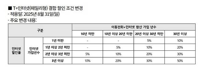 오늘(11일) SKT와 SKB에 따르면 오는 31일부터 'T+인터넷(패밀리형) 결합할인' 조건이 바뀝니다. SKB는 "인터넷 가입년수 조건이 추가된다"라면서 "30일까지 인터넷에 가입한 고객은 기존 혜택을 그대로 받을 수 있다"라고 설명했습니다.