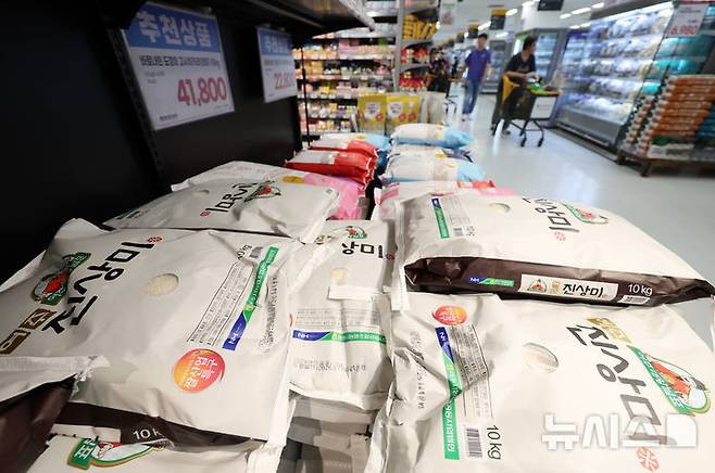 주식인 쌀 가격은 7.6% 올라 2024년 3월(7.7%) 이후 1년 4개월 만에 다시 7%대 상승률을 나타냈고, 라면 가격은 6.5% 상승하며 3개월 연속 6%대 상승세를 유지하고 있다. 오징어채(42.9%), 조기(13.4%), 고등어(12.6%) 등의 가격이 두 자릿수 상승률을 보였고, 빵 및 곡물 가격도 6.6% 상승하며 2023년 9월(6.9%) 이후 1년 10개월 만에 가장 큰 상승폭을 기록했다. 사진은 11일 서울의 한 마트에 쌀이 진열돼 있다. 2025.08.11. bluesoda@newsis.com