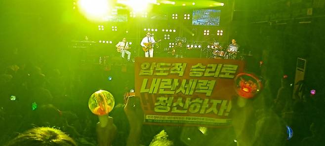 | ▲ 백자 2025 콘서트 장면 <압도적 승리로 내란 세력 청산하자>는 관객의 손팻말이 백자의 지나온 삶을 웅변하듯이 인상적이다. |