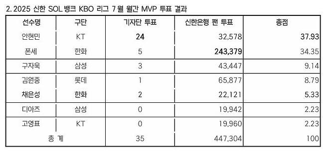 팬투표 54.4% 득표 '투수 괴물' 폰세가 밀렸다, 7월 월간 MVP '타자 괴물' 안현민