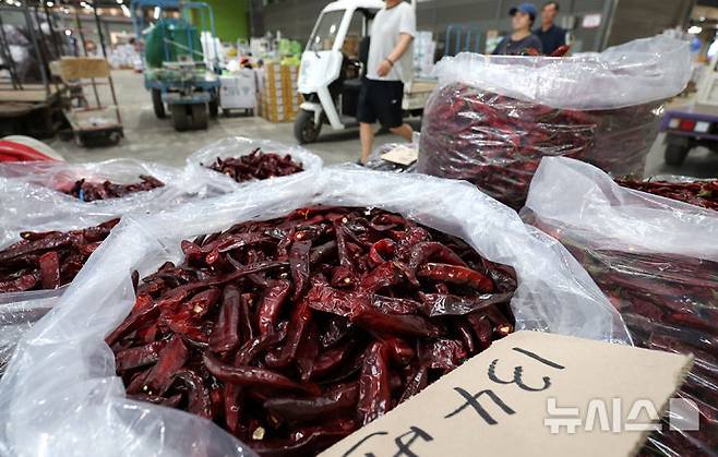 [서울=뉴시스] 전진환 기자 = 태양초 고추가 본격 출하되는 가운데 11일 인천 남동구 남촌농수산물도매시장에 태양초 건고추가 판매되고 있다. 2025.08.11 amin2@newsis.com