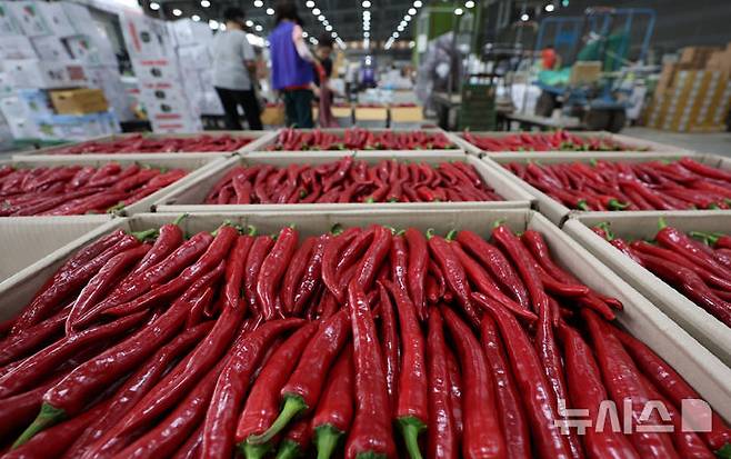 [서울=뉴시스] 전진환 기자 = 태양초 고추가 본격 출하되는 가운데 11일 인천 남동구 남촌농수산물도매시장에서 시민들이 고추를 살펴보고 있다. 2025.08.11 amin2@newsis.com