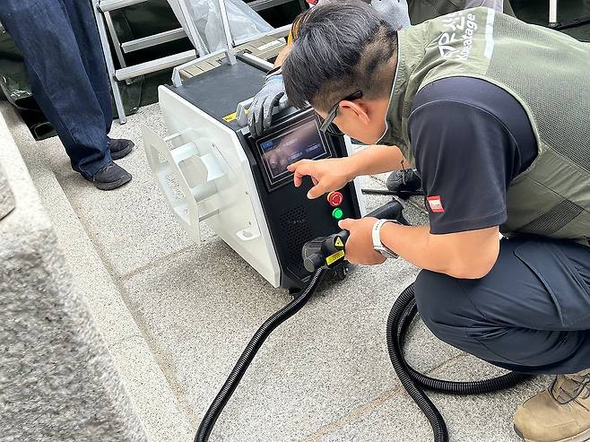 (서울=연합뉴스) 김예나 기자 = 11일 서울 경복궁 광화문 석축에 매직으로 쓴 낙서를 지우기 위해 문화유산 보존처리 업체 관계자들이 레이저 기기 작업을 준비하고 있다. 2025.8.11