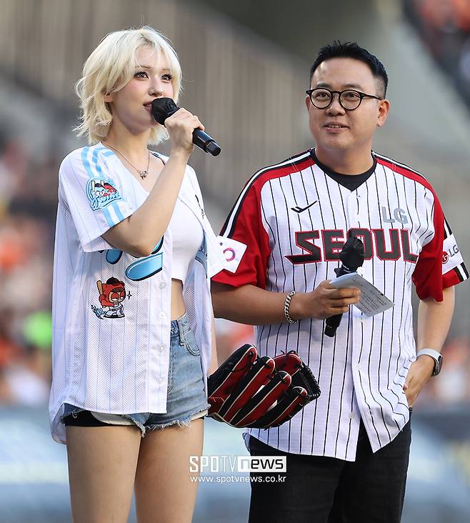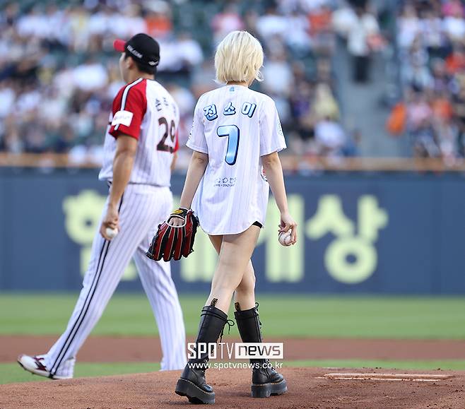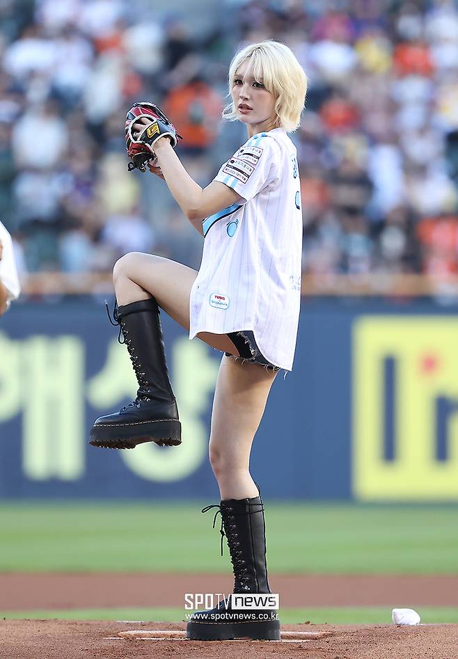 이날 경기에 앞서 전소미가 시구자로 나섰다. 크롭티에 핫팬츠를 입은 그는 마운드에 올라가 진짜 야구 선수같은 투구폼을 선보였다.