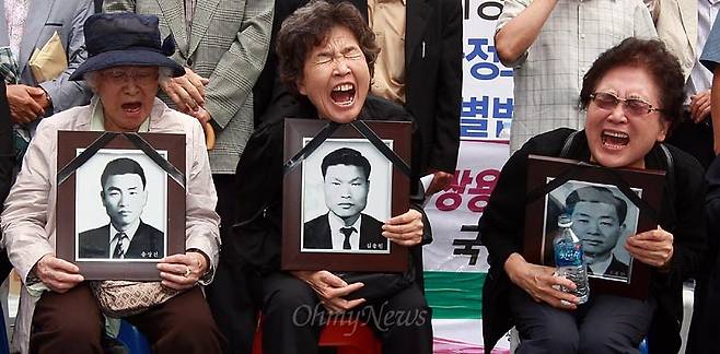 | ▲ 12일 오후 여의도 새누리당사앞에서 열린 '인혁당재건위사건 '사법살인' 부정하는 박근혜 규탄 기자회견'에서 고 송상진씨 부인 김진생씨, 고 김용원씨 부인 유승옥씨, 고 우홍선씨 부인 강순희씨가 울부짖고 있다. |