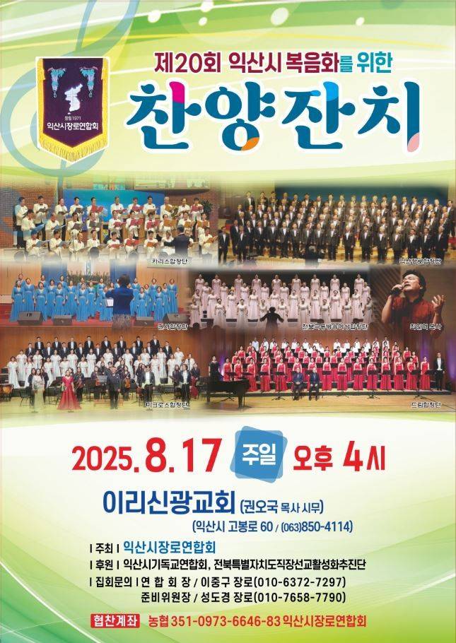 전북 익산시 장로회(회장 이중구 장로)는 오는 17일 주일 오후 4시 이리신광교회(권오국 목사)에서 제20회 ‘익산시 복음화를 위한 찬양잔치’를 개최한다. 행사는 익산 지역 교회와 성도들이 한자리에 모여 찬양으로 하나님께 영광을 돌리고, 지역 복음화의 사명을 새롭게 다지는 시간으로 진행된다.