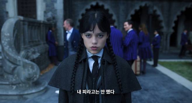 여기에 몇 스푼이나 더 첨가된 것이 팀 버튼식 공포영화에 대한 애정과 웬즈데의 시니컬한 캐릭터일 터. 팀 버튼의 청소년기 페르소나라 할 수 있는 '웬즈데이'로 빙위한 듯한 제나 오르테가의 연기 또한 더 깊어졌다.
