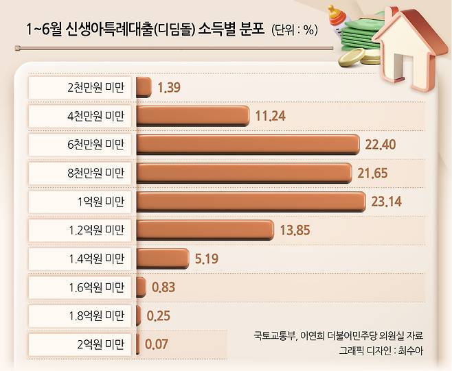 올 상반기 신생아특례대출 차주 가운데 연소득이 ‘2000만원 미만’인 차주는 1.39%, ‘4000만원 미만’ 11.24%로 높지 않은 편이다. 반면 ▷6000만원 미만 22.4% ▷8000만원 미만 21.65% ▷1억원 미만 23.14% ▷1억2000만원 미만 13.85% 등으로 중소득자의 비중이 높았다.