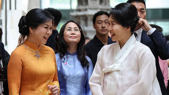 두 영부인은 오늘 오전 각자 전통의상인 한복과 아오자이를 착용하고 유홍준 국립중앙박물관장의 설명을 들으며 반가사유상과 외규장각 의궤, 백자 달항아리 등을 관람했습니다.