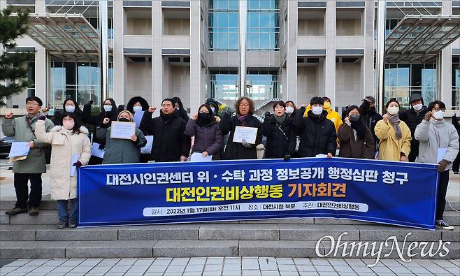 | ▲ 지난 2023년 1월 17일 대전지역 시민단체로 구성된 '반인권단체의 인권기구 장악 대응, 대전비상행동'은 대전시청 북문 앞에서 기자회견을 열어 "우리는 대전시의 부당하고 불투명한 민간위탁 행정에 문제를 제기하며, 수탁심사위원회 정보공개 거부 처분 취소에 대한 행정심판을 청구한다"고 밝혔다. (자료사진) |