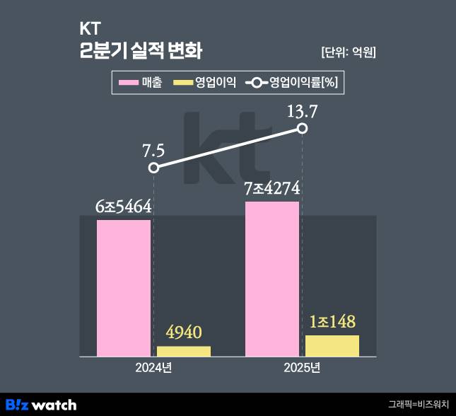KT가 올해 2분기 영업이익 1조원을 돌파하며 사상 최대 실적을 올렸다. 본업인 유·무선 사업이 견조했던 가운데 그룹 계열사의 서울 강북본부 부지 개발에 따른 일회성 분양이익 등이 반영된 게 주효했다.