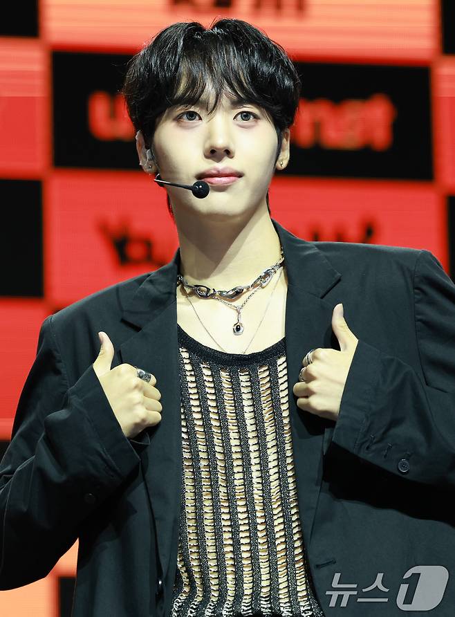(서울=뉴스1) 권현진 기자 = 그룹 아이덴티티(idntt)의 첫 유닛 유네버맷(unevermet) 최태인이 11일 오후 서울 한남동 블루스퀘어에서 가진 데뷔 앨범 '유네버멧' 발매 기념 쇼케이스에 참석해 포즈를 취하고 있다. 2025.8.11/뉴스1