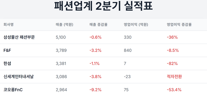 의류 소비 위축과 이상 기후 영향 등이 겹치면서 올해 2분기에도 주요 패션기업들이 부진한 실적을 기록했다.