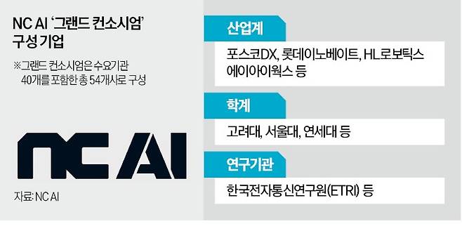 NC AI는 이번 프로젝트를 위해 서울대, KAIST, 한국전자통신연구원(ETRI) 등 학계와 롯데이노베이트, 포스코DX, SK스토아 등 산업계 54개 사 및 기관이 참여하는 국내 최대 규모 '그랜드 컨소시엄'을 꾸렸다.