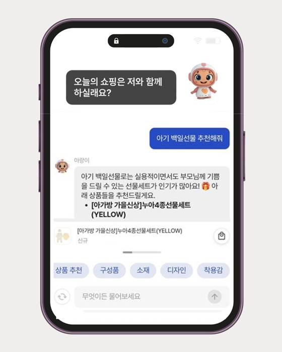 아가방몰은 육아용품 선택에 익숙하지 않은 예비 부모와 손주, 조카, 지인 선물을 고민하는 고객이 보다 쉽게 상품을 선택할 수 있도록 AI 큐레이션과 원스탑 쇼핑 경험을 제공하는 데 중점을 뒀다.