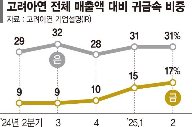 11일 업계에 따르면, 고려아연의 올해 2·4분기 별도 기준 매출은 2조4614억원, 영업이익은 2665억원으로 전년 동기 대비 각각 23.8%, 3.5% 증가했다. 분기 매출은 사상 최대를 경신했다. 호실적의 핵심 배경으로는 귀금속이 꼽힌다. 2·4분기 전체 매출에서 금과 은이 차지한 비중은 각각 17%, 31%로 전년 동기 대비 각각 8%포인트(p), 2%p 확대됐다. 금 판매액은 7732억원으로 2배 이상 급증했고 은 판매액은 1조5193억원으로 39.8% 늘었다. 지정학 리스크 심화와 관세협상 등 글로벌 경제 불확실성이 지속되면서 금과 은 등 안전자산 선호 심리가 반영된 결과로 풀이된다.
