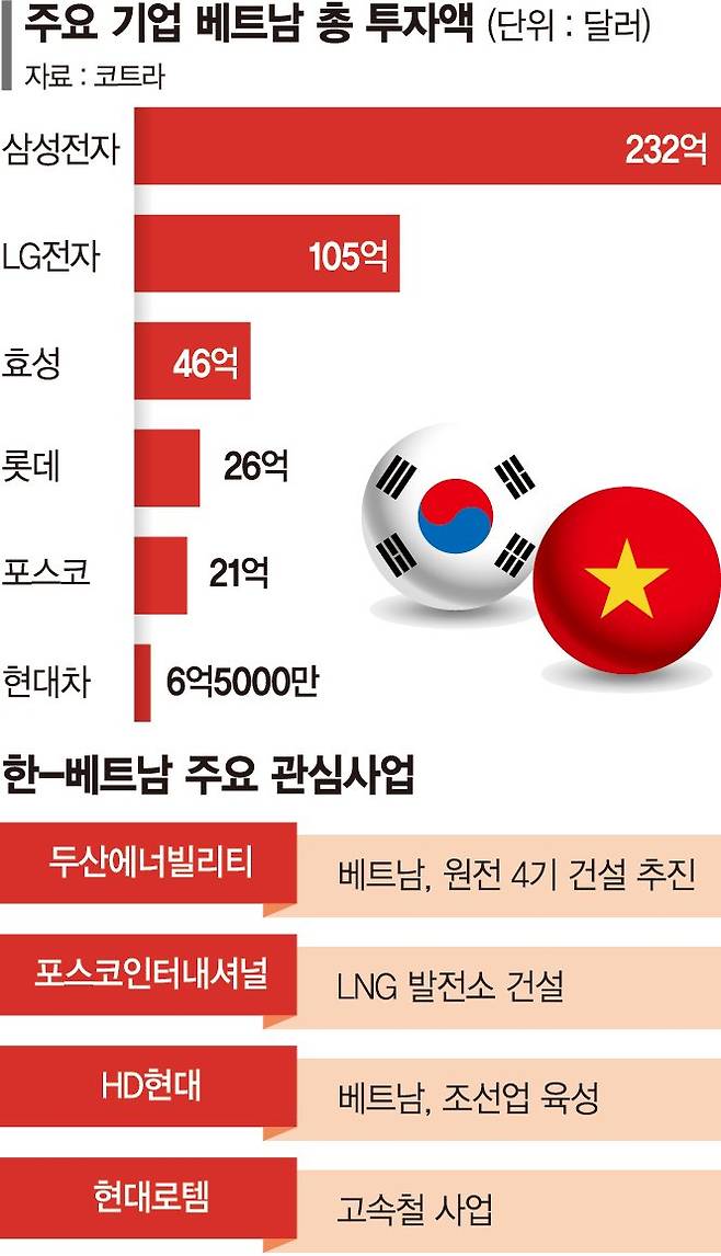 삼성, LG 등의 현지 투자 확대도 주목된다. 베트남 최대 투자기업으로 사실상 '베트남 국민기업'으로까지 불리는 삼성전자는 올해까지 베트남에 총 224억달러(31조1000억원)를 투자하는 데 이어 향후 첨단산업을 중심으로 연간 10억달러를 추가 투자할 계획이다.